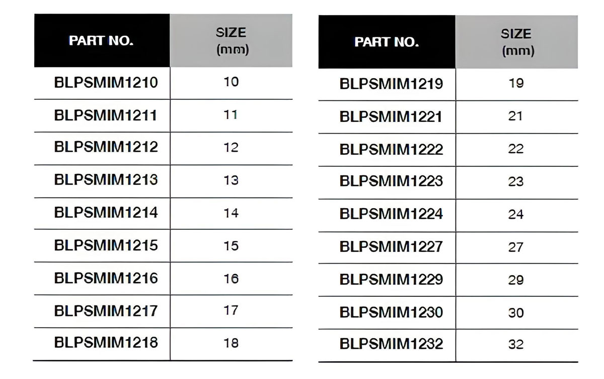 Size + Kích Thước | BLPSMIM1210 – 1/2" – M10, BLPSMIM1212 – 1/2'' – M12, BLPSMIM1214 – 1/2'' – M14, BLPSMIM1217 – 1/2'' – M17, BLPSMIM1219 – 1/2'' – M19, BLPSMIM1224 – 1/2'' – M24, BLPSMIM1227 – 1/2'' – M27, BLPSMIM1230 – 1/2'' – M30, BLPSMIM1232 – 1/2'' – M32 |