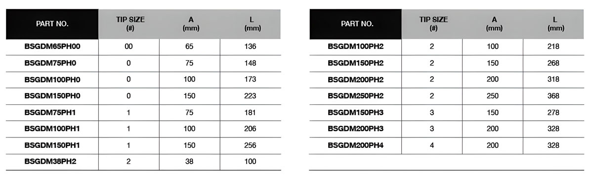 Size + Kích Thước | BSGDM150PH1 – PH1 x 150mm, BSGDM150PH2 – PH2 x 150mm, BSGDM200PH3 – PH3 x 200mm, BSGDM200PH4 – PH4 x 200mm, BSGDM250PH2 – PH2 x 250mm, BSGDM38PH2 – PH2 x 38mm, BSGDM75PH1 – PH1 x 75mm |
